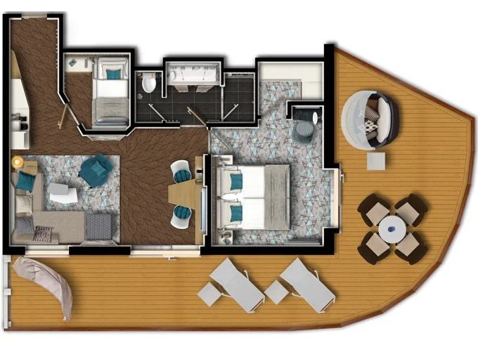 SUDO - Diamant Suite 42 m² + balkón 47 m² so stolom so 4 stoličkami, s hojdacou sieťou, 2 ležadlami a posteľou Sun island. Spálňa (manželská posteľ), obývacia izba (rozkladacia pohovka), 2. spálňa (lôžko a vyklápacia posteľ), hracia konzola. 6. paluba. Max 6 osoby. Výhody Suite. 20 885 € 4 177 € za osobu